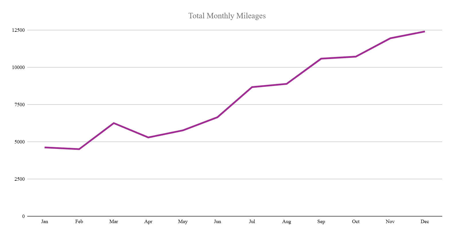 Mesur amlwg arall rydym yn ei ddefnyddio yw cyfanswm y milltiroedd misol a yrrir, ac mae ein niferoedd yn symud yn gyson i’r cyfeiriad cywir wrth i ni barhau i ehangu ein rhwydwaith.