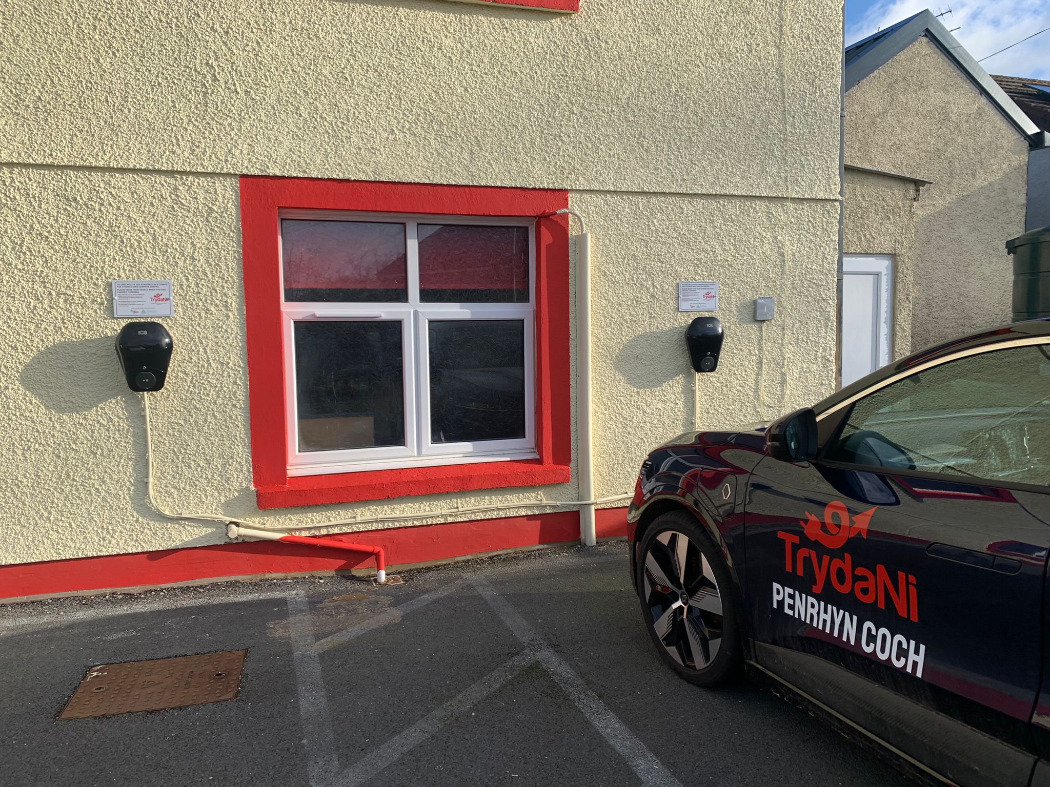 Mae pwynt gwefru TrydaNi yn yr un lle â'r cerbyd, yn Neuadd y Penrhyn. Defnyddiwch y cerdyn ICS rhagdaledig a geir yn y car i ddechrau gwefru.